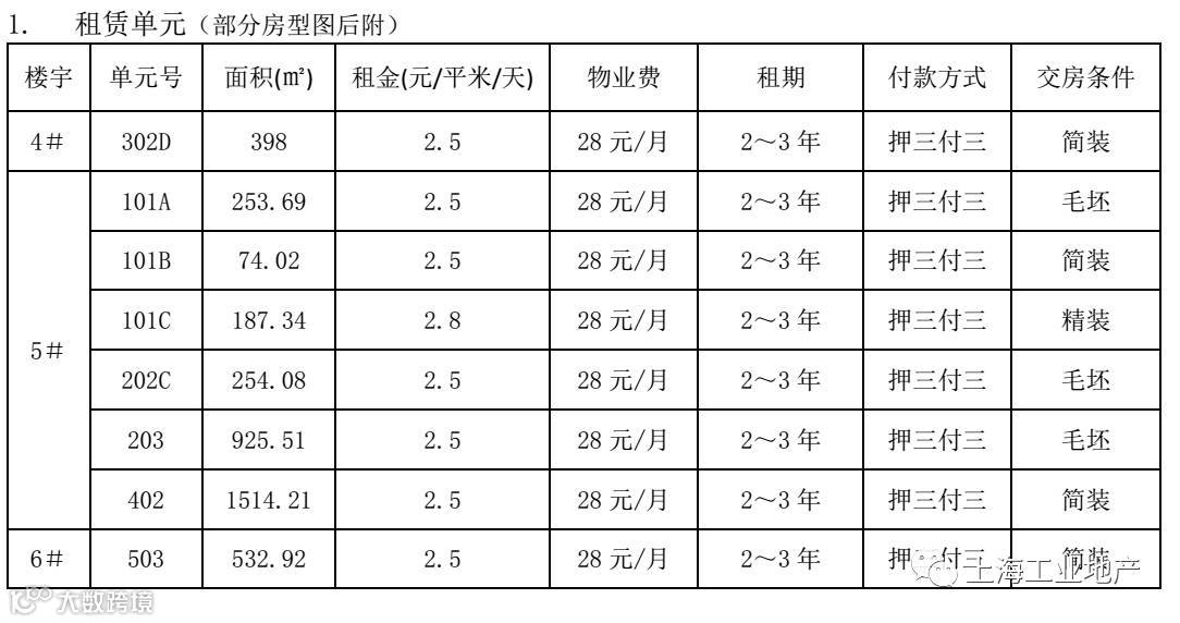可租面积100平-2000平不同类型均有,租金在2.5元-2.8元/平/天,物业费28元/月/平,付款方式押三付三。