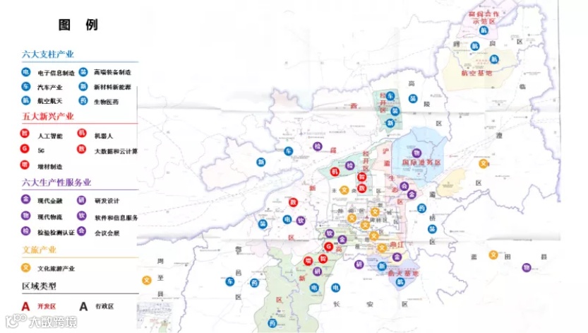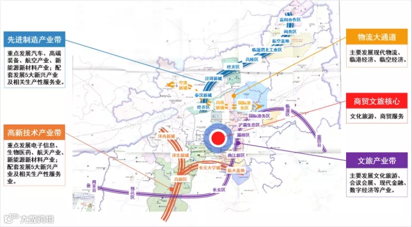 ——先进制造产业带以经开区为引领,主要包含经开区、西咸新区(秦汉新城、泾河新城)、高陵区、航空基地、阎良区、富阎产业合作园区等区域。重点发展汽车、高端装备、航空产业、新能源新材料产业;配套发展5大新兴产业及相关生产性服务业。