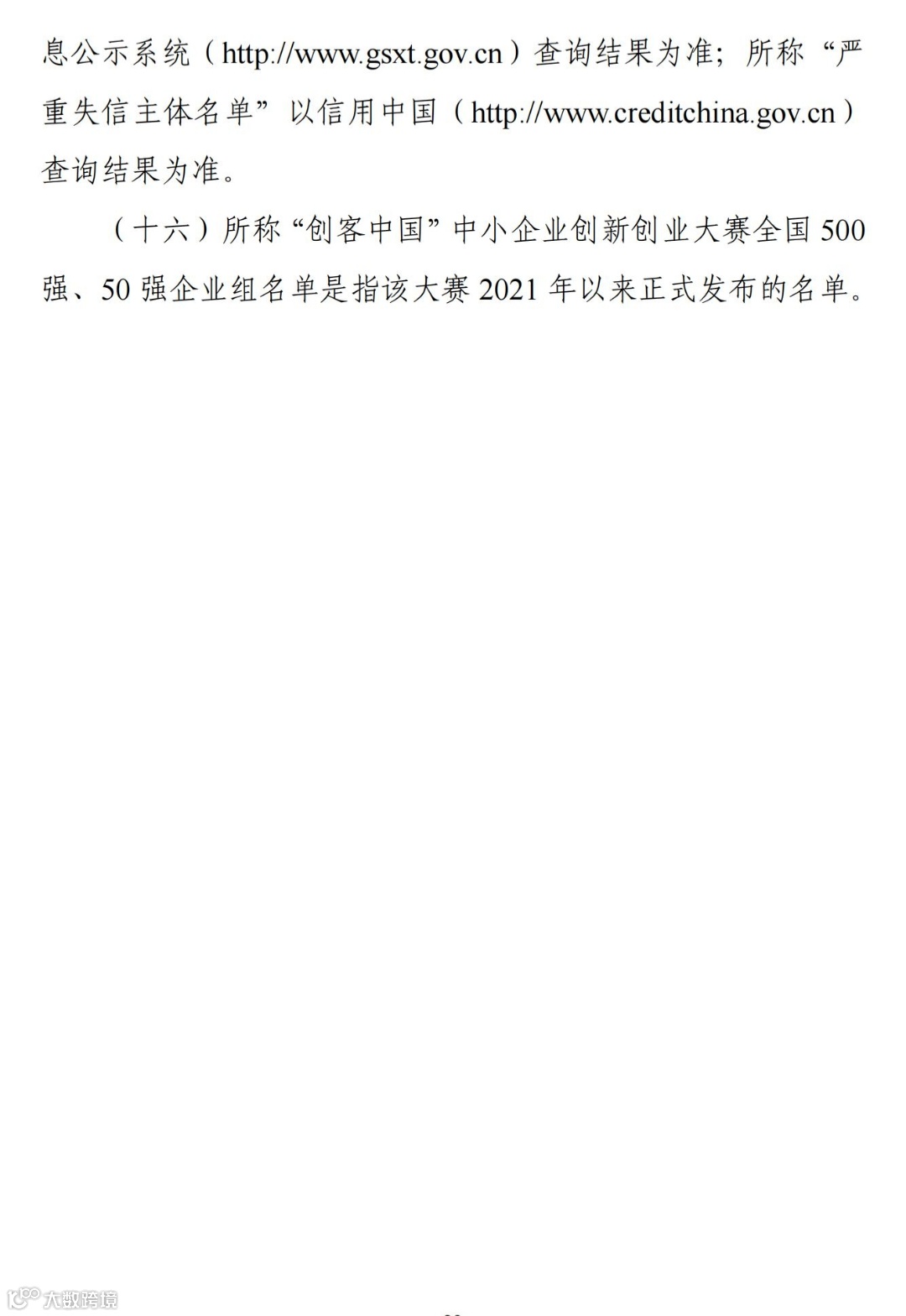 (十六)所称“创客中国”中小企业创新创业大赛全国 500强、50 强企业组名单是指该大赛 2021 年以来正式发布的名单。