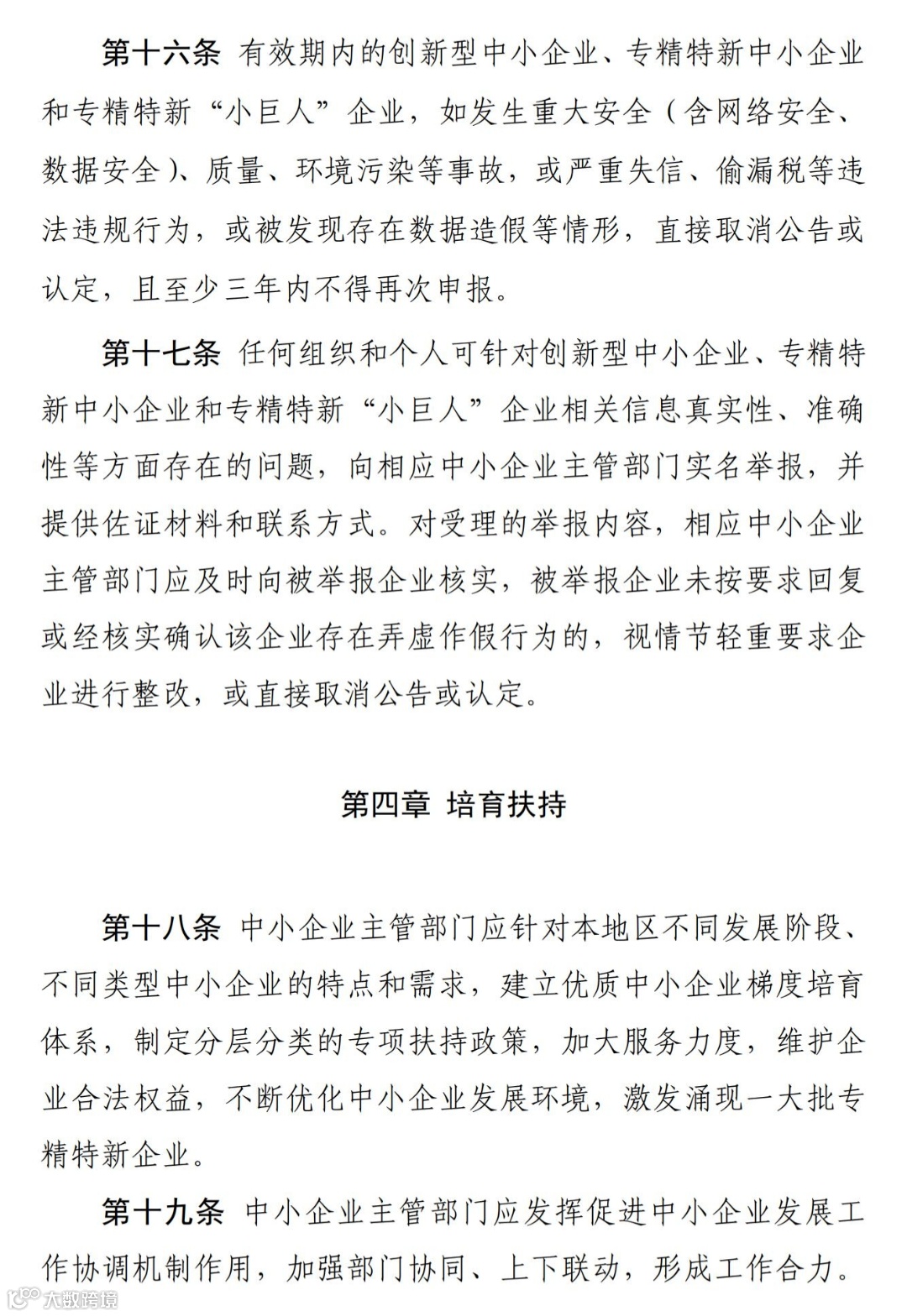 第十六条 有效期内的创新型中小企业、专精特新中小企业和专精特新“小巨人”企业,如发生重大安全(含网络安全、数据安全)、质量、环境污染等事故,或严重失信、偷漏税等违法违规行为,或被发现存在数据造假等情形,直接取消公告或认定,且至少三年内不得再次申报。