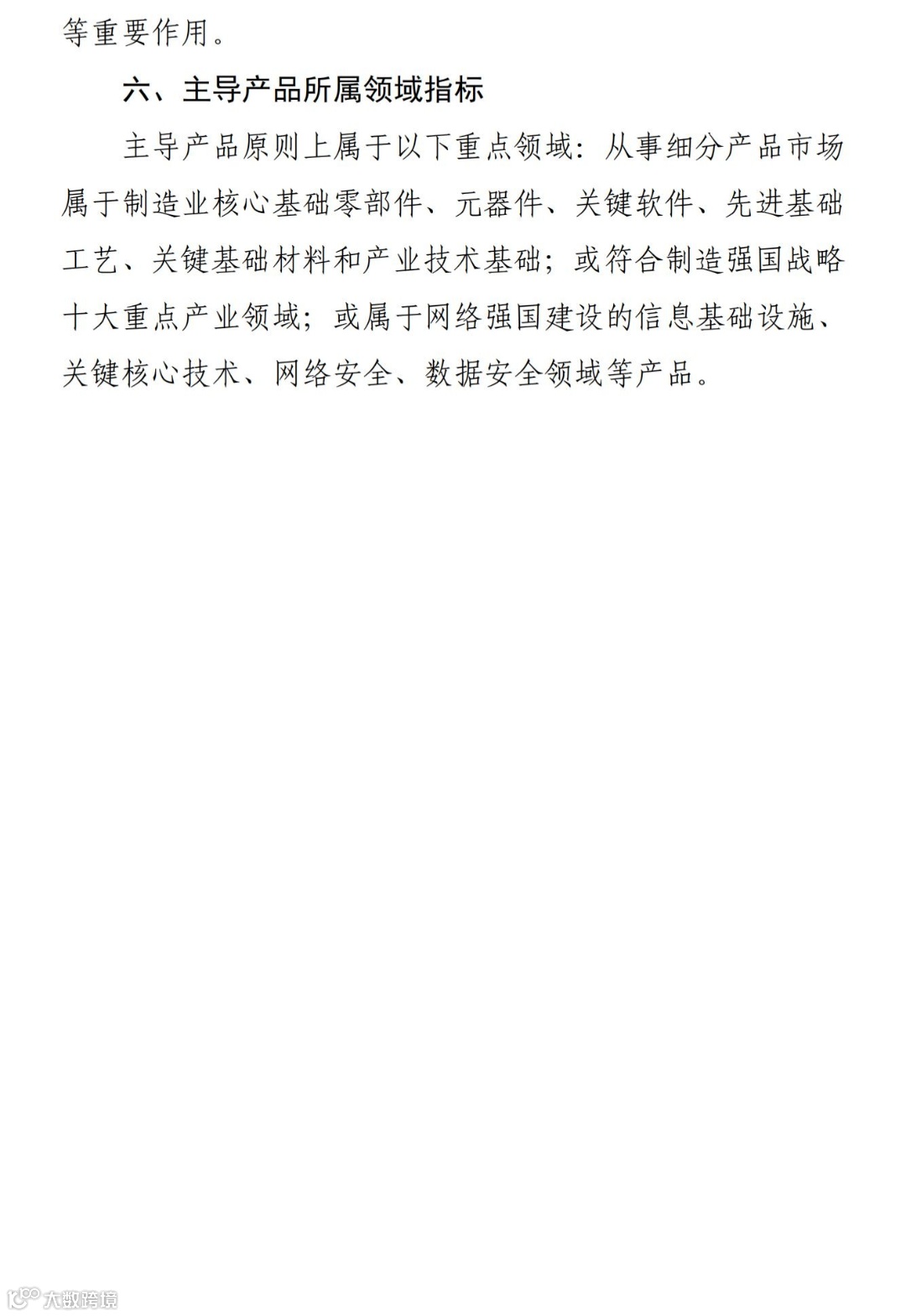 主导产品原则上属于以下重点领域:从事细分产品市场属于制造业核心基础零部件、元器件、关键软件、先进基础工艺、关键基础材料和产业技术基础;或符合制造强国战略十大重点产业领域;或属于网络强国建设的信息基础设施、关键核心技术、网络安全、数据安全领域等产品。