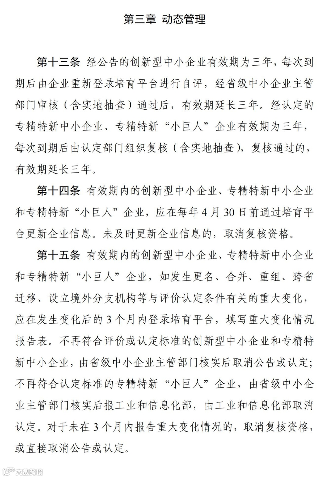 第十五条 有效期内的创新型中小企业、专精特新中小企业和专精特新“小巨人”企业,如发生更名、合并、重组、跨省迁移、设立境外分支机构等与评价认定条件有关的重大变化, 应在发生变化后的 3 个月内登录培育平台,填写重大变化情况报告表。不再符合评价或认定标准的创新型中小企业和专精特新中小企业,由省级中小企业主管部门核实后取消公告或认定;不再符合认定标准的专精特新“小巨人”企业,由省级中小企业主管部门核实后报工业和信息化部,由工业和信息化部取消认定。对于未在 3 个月内报告重大变化情况的,取消复核资格, 或直接取消公告或认定。