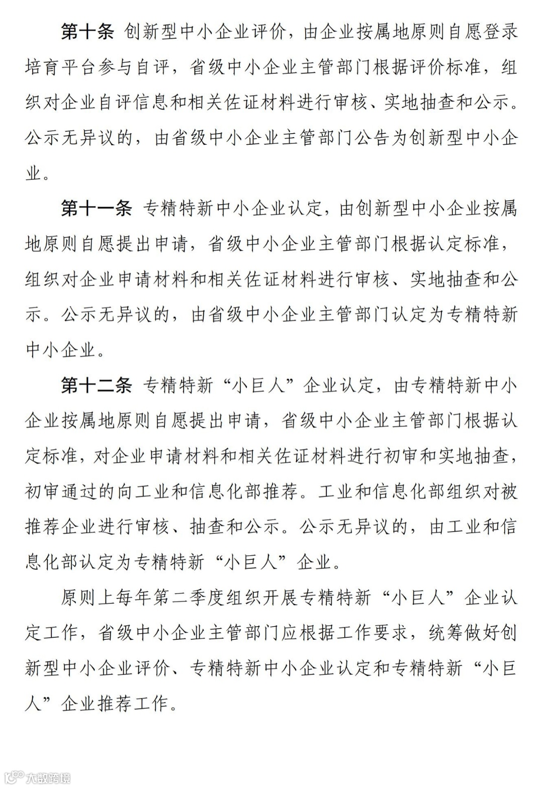第十二条 专精特新“小巨人”企业认定,由专精特新中小企业按属地原则自愿提出申请,省级中小企业主管部门根据认定标准,对企业申请材料和相关佐证材料进行初审和实地抽查, 初审通过的向工业和信息化部推荐。工业和信息化部组织对被推荐企业进行审核、抽查和公示。公示无异议的,由工业和信息化部认定为专精特新“小巨人”企业。