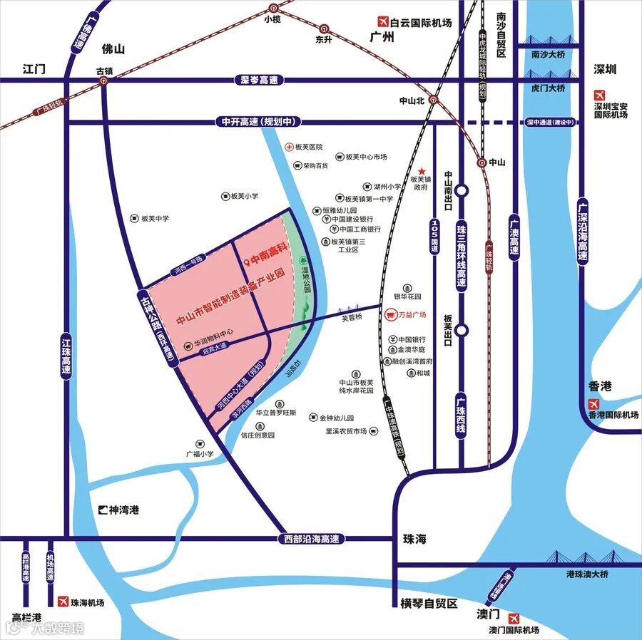 【交通】:项目位于中山市板芙镇,地处珠三角核心区,具有四通八达的水陆空交通网络;园区占据极致区位,公路、铁路、城轨、高速、机场、港口等交通配套一应俱全;105国道、广珠西线贯穿全镇;半小时内可到达中山港、神湾港、高栏港等三大港口;目前,中山市城轨规划7条线路,其中5号线在板芙镇内设立3个站点;湾区纵横乐无忧。