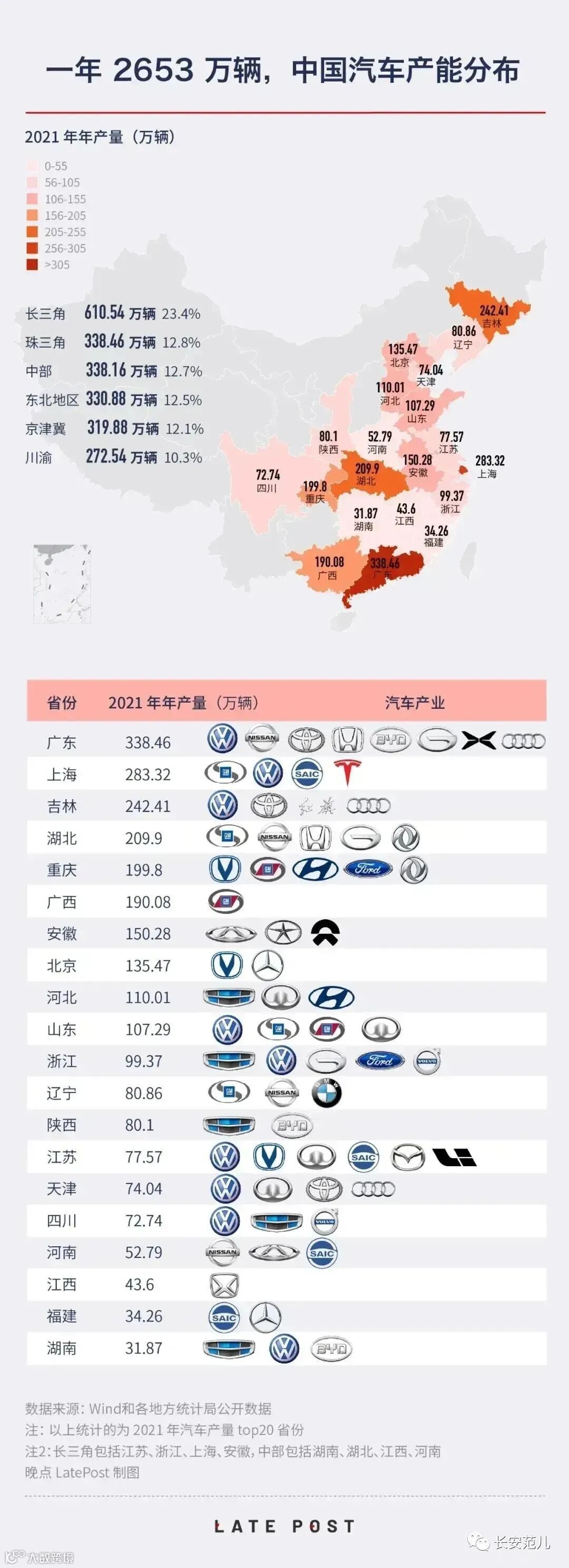 2021年全国各省区(市)汽车产量榜单地图显示,陕西省2021年实现汽车产量达80.1万辆,排名全国第12位,高于江苏和天津,主要车型是吉利、比亚迪和陕汽。其中,吉利主要分布在宝鸡基地和西安基地,比亚迪主要分布在西安基地和商洛基地,而陕汽产能主要在宝鸡和西安两市。