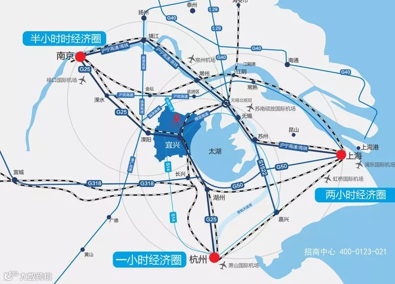 宜兴市位于长三角经济带腹地,位于上海2小时经济圈内,南京半小时经济圈内,杭州1小时经济圈内。三大经济圈重叠造就宜兴得天独厚的地理优势。宜兴境内有宁杭、锡宜等高速公路、G104、S342、 S230、 S240等4条国、省干线公路,宁杭高铁宜兴站位于宜兴市龙背山森林公园南麓、104国道与陶都路之间,并有航道77条,航道总里程594公里。