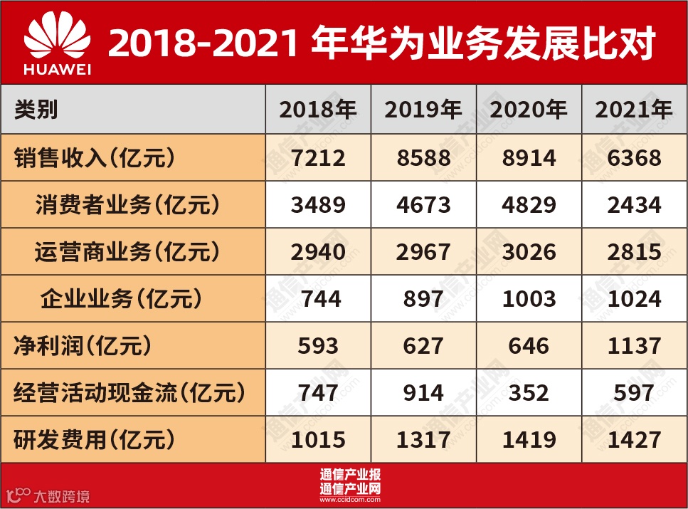 3月28日,华为通过9种语言向全球线下和在线发布了2021年年度经营业绩。报告显示,华为整体经营稳健,实现全球销售收入6368亿元人民币,同比下降28.56%,净利润1137亿元人民币,同比增长75.9%。而这也是华为在美国制裁近三年,首次呈现营收负增长。