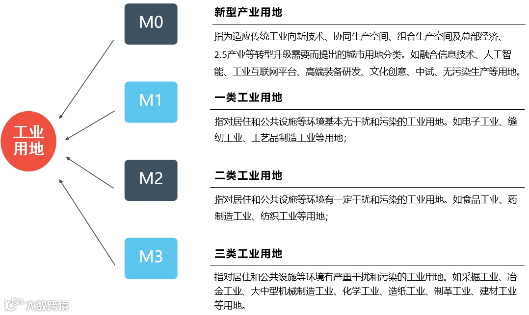 《城市用地分类与规划建设用地标准》将工业用地分为一类工业用地(M1)、二类工业用地(M2)和三类工业用地(M3)。随着城市更新的快速发展,在工业用地(M类)中增加了新型产业用地(M0)。