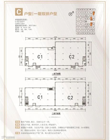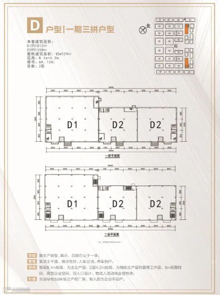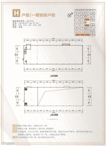 框架厂房层高:首层8m,二层及以上层高6.6m,二、三层独栋或多拼,面积1200平起