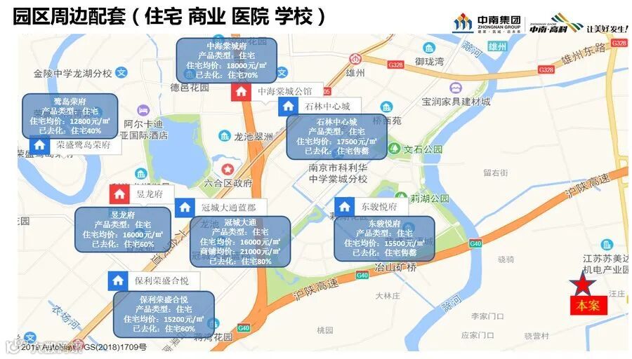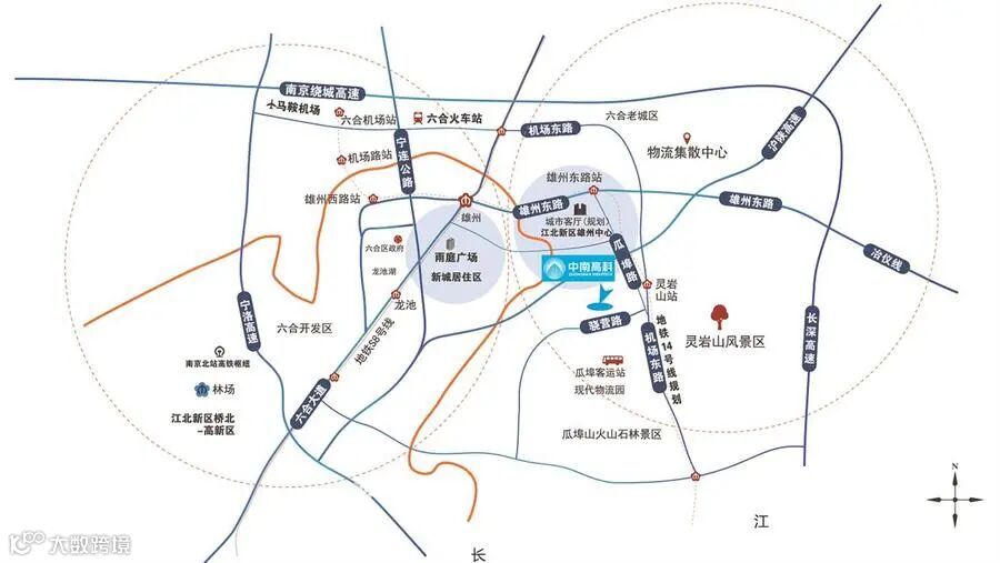 【周边交通】:临近G40 沪陕高速、宁连公路。南京六合火车站,距离约6.3KM, 至六合区中心城区约 4.5KM,至南京马 鞍国际机场约 9.5KM.