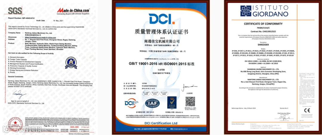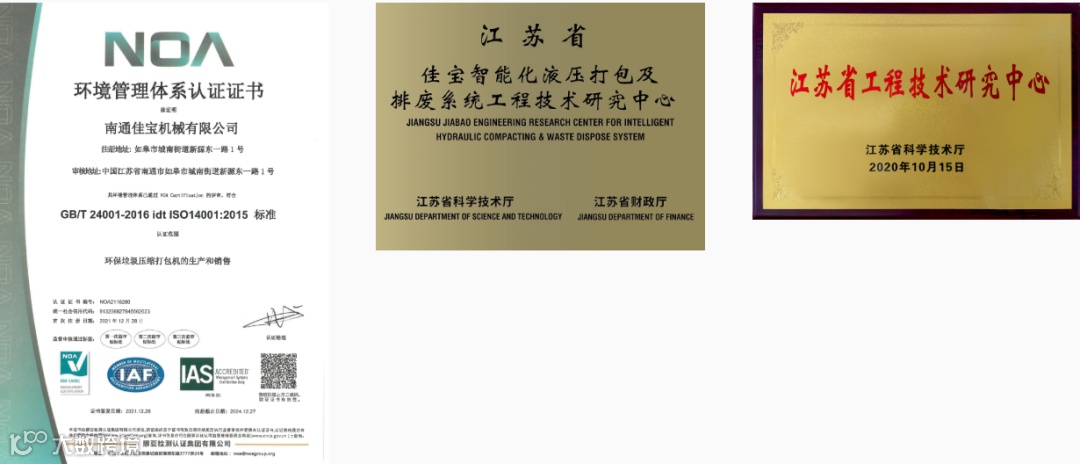 南通佳宝机械有限公司先后通过ISO9001-2015质量管理体系认证及ISO14001:2015环境管理体系认证,获得欧盟CE安全认证、SGS、TUV认证。同时,还荣获“高新技术企业”、“高新技术产品认定”证书,设有省级智能化液压打包及排废系统工程技术研究中心。