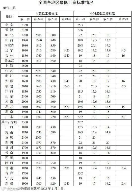 1月2日,人社部官网发布了全国各地区最低工资标准情况(截至2023年1月1日),上海月最低工资标准达到2590元,为全国最高。14个地区月最低工资标准达到2000元及以上