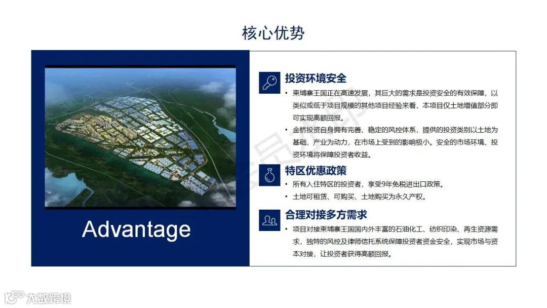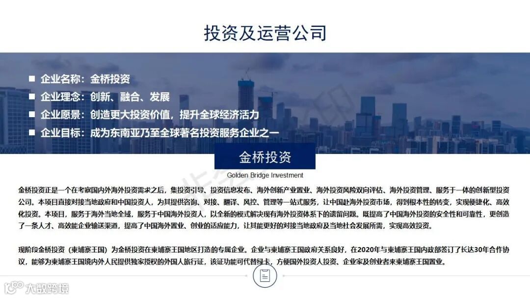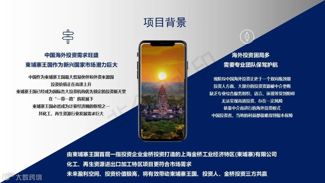 本项目由上海金桥工业经济特区(柬埔寨)有限公司投资开发,总占地面积为970公顷,计划特区内总投资额达400亿美元,特许经营期限为:永久,将为当地提供5万个就业岗位。