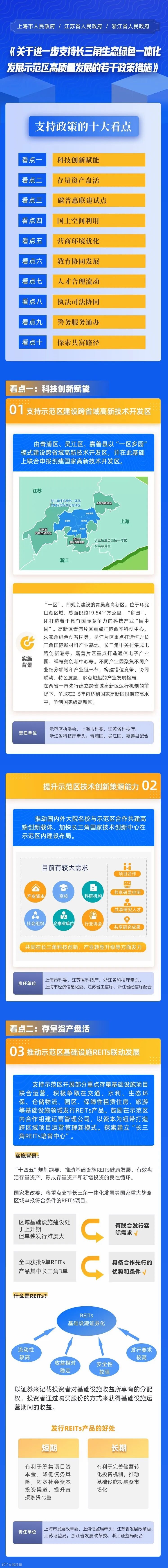 二是存量资产盘活。比如,第三条“推动示范区基础设施REITs联动发展”,是着眼于落实国家和两省一市有关强化长三角基础设施REITs联动发展的要求,加大存量资产盘活力度,先行先试拓宽示范区建设投融资渠道。有了相应的政策支撑,示范区建设、尤其是“一厅三片”重点区域建设,通过联合的方式发行REITs产品,不仅具备合作先行的优势和条件,还将在长三角更大范围发挥示范带动作用。