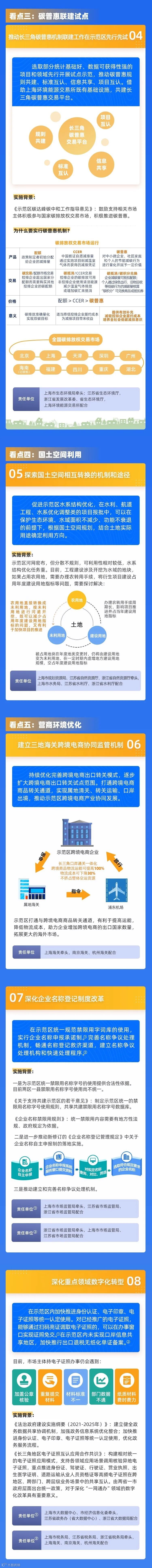 五是营商环境优化。主要是第六条、第七条、第八条,为建立三地海关跨境电商协同监管机制、深化企业名称登记制度改革、在深化重点领域数字化转型中解决有关堵点、难点问题提供了政策依据。比如,目前,市场主体持电子证照办事不顺的问题,在同一行政区域内还偶有发生,在跨省域的不同行政区域,电子证照、电子印章的互认问题更加突出。这次政策重点推进一批高频电子证照在跨地区、跨部门、跨层级业务场景中的共享互认, 为市场主体在示范区“跨省通办”提供高效、便利的服务,让数据多跑腿,群众少跑路。