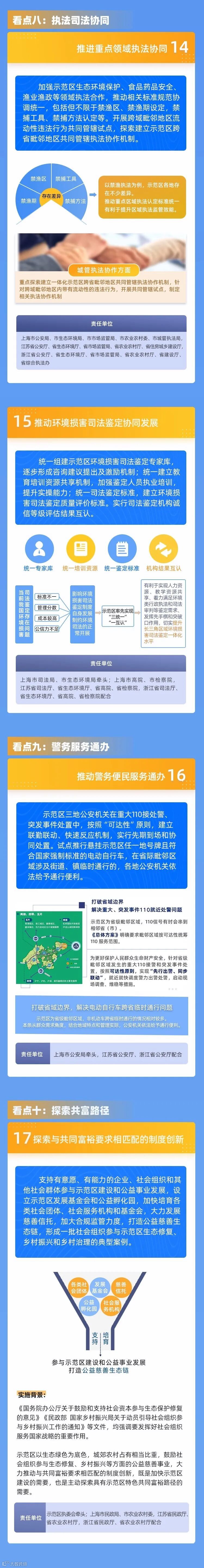 十是探索共富路径。政策第十七条支持、鼓励社会组织参与示范区建设,跨省域探索共同富裕路径。共同富裕是示范区要进一步探索的重点制度创新领域,欢迎广大优质市场主体、社会组织参与示范区生态修复、乡村振兴和乡村治理,形成更多惠民利民的实践案例。