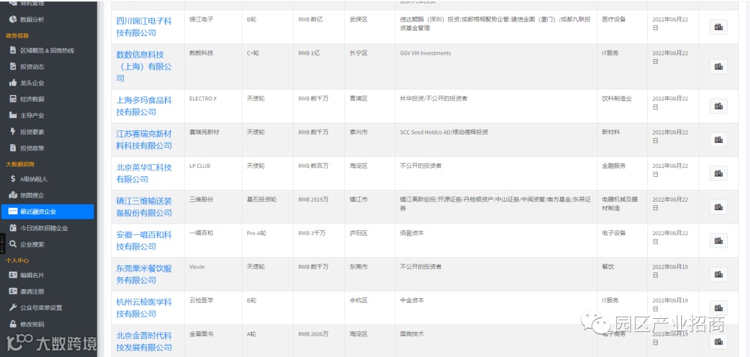 除了为开发区打造一个线上招商门户平台外,您还可查询各类企业信息、查看最近获得融资企业信息、活跃招聘中的企业信息、按地图查询意向招商企业、纳税良好的企业等。功能费价值5万/年。
