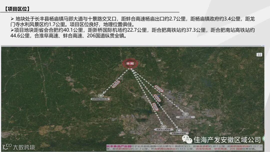 长丰佳海食品产业园位于长丰县杨庙镇马郢大道与十景路交叉口。杨庙镇位于长丰县中部,距离合肥市区30多公里,拥有优美的地理环境,良好的产业基础。在长三角一体化规划中,皖西北是重要的粮食、肉类等农产品生产基地。而杨庙镇恰好处于皖西北农产品进入合肥及长三角的重要通道,生产要素具有很强的竞争力,是发展食品加工制造业的首选之地。