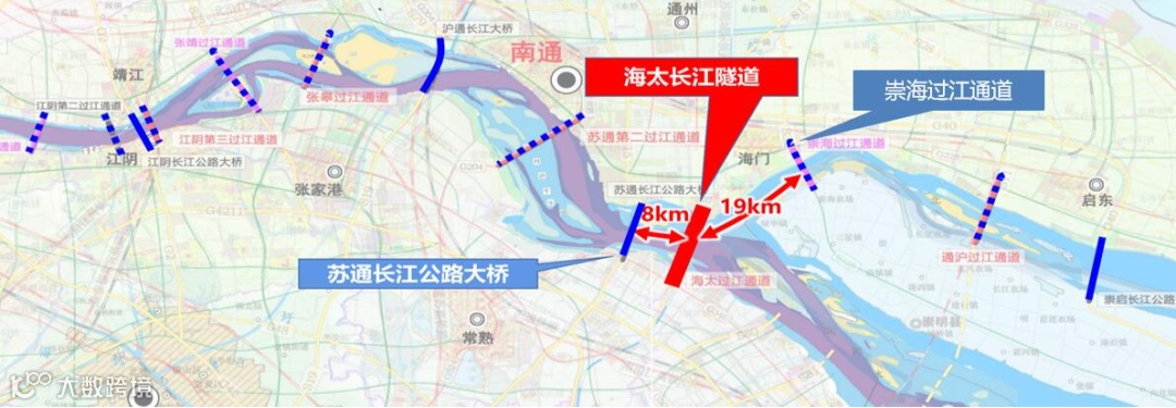 海太过江通道位于苏通大桥下游约8公里处,是国家发展和改革委印发的《长江干线过江通道布局规划(2020-2035年)》中明确的公铁复合型过江通道。其公路部分为《江苏省高速公路网规划(2017-2035年)》中通州湾至常熟高速公路的过江设施,铁路部分为《长江三角洲地区多层次轨道交通规划》中如通苏湖城际铁路的过江设施。
