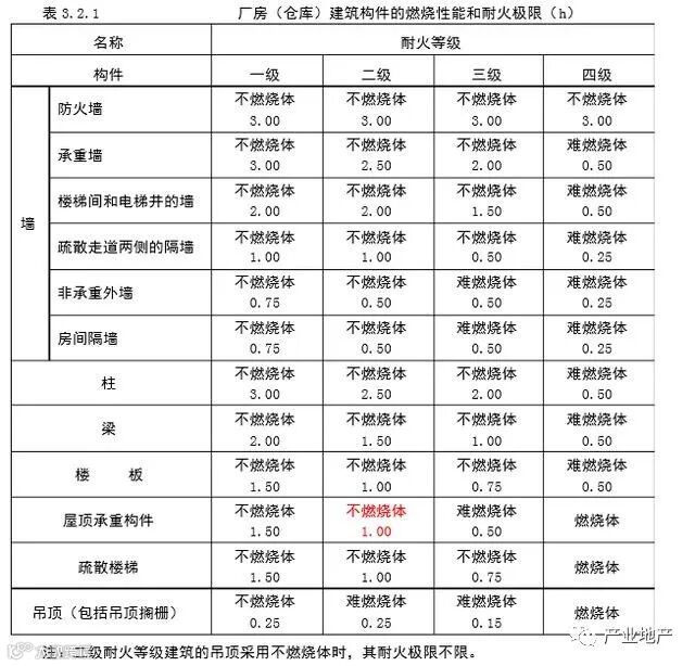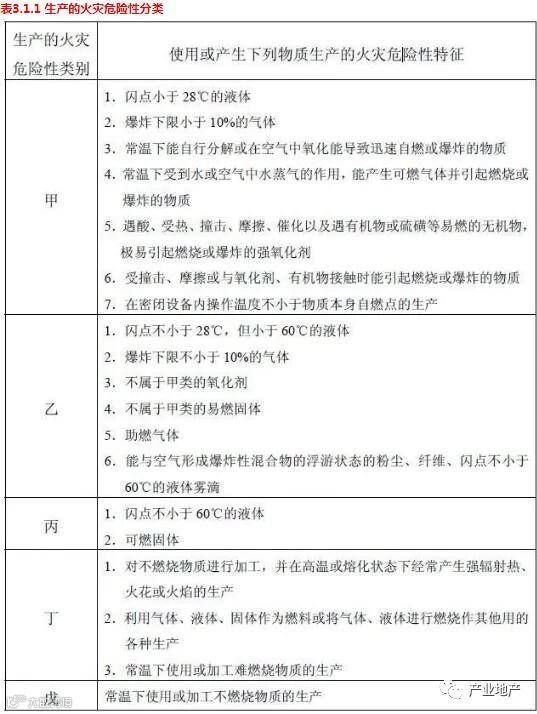 而这里的“丙二类”可以拆分为两个不同的等级规定类型: 丙:是指厂房生产的火灾危险性划分等级,根据《建筑设计防火规范》(下称《规范》)第3.1.1 条显示:生产的火灾危险性应根据生产中使用或产生的物质性质及其数量等因素分,可分为甲、乙、丙、丁、戊类,五个等级类别。 二:是指厂房的耐火等级,根据厂房不同程度的防火性能,顾名思义,分为一、二、三、四,四个等级。 所以,“丙二类”厂房是指,该厂房的可生产的危险等级为:丙,厂房建筑的耐火性为二级。那么,我拥有的“丙二类”厂房到底能生产什么类型的东西呢?我生产存储易燃品是否适用呢? 首先,我们来分析一下生产火灾危险性的五个等级:如下表所示 上表显示,当生产的产品符合上述的条件是(其中一条)所使用的厂房需要达到该类别的要求才可以生产,否则将会产生生产安全隐患。 当然,《规范》表示对于火药、炸药及其制品厂房(仓库) 、花炮厂房(仓库),由于这些建筑内的物质以剧烈的化学爆炸,防火要求特殊,有关建筑设计中的防火要求在《民用爆破器材工程设计安全规范》GB 50089、《烟花爆竹工厂设计安全规范》GB 50161 等规范中有专门规定,本规范的适用范围不包括这些建筑或工程。这里便不对这类型的生产做赘述。 上表中的闪点,是指:闪点,是在规定的试验条件下,使用某种点火源造成液体汽化而着火的最低温度。闪燃是液体表面产生足够的蒸气与空气混合形成可燃性气体时,遇火源产生短暂的火光,发生一闪即燃的现象。闪燃的最低温度称为闪点。(此段来源百度百科) 通俗来讲,就是当液体汽化的时候,附近能够点燃这个气体的最低温度,就是闪点。 让我们来举个例子吧:我们常用的柴油:它的闪点根据测量是60℃以上,也就是说,当它周围的温度没有达到60℃的时候,它是不会着火的。而一般气体打火机是采用丁烷气体作燃料的,丁烷燃烧的火焰中心温度1800度左右。煤油燃烧的火焰中心温度1660度左右。汽油燃烧的火焰中心温度1520度左右。明火的温度是远远高于柴油的闪点的,这也是加油站内禁止吸烟的原因。 爆炸下限:燃蒸气、气体或粉尘与空气组成的混合物遇火源即能发生爆炸的最低浓度(可燃蒸气、气体的浓度,按体积比计算)。 爆炸下限理解相对简单,我们在新闻中听到的粉尘爆炸,如面粉厂,煤矿等典型区域,就会产生相对的粉尘,不是指产生了粉尘就会产生爆炸,必须符合两个条件:1.一定的浓度2.火源。而其中最低的浓度就是指爆炸下限。 以面粉(谷物淀粉)为例,面粉的爆炸下限是45g/m3也就是说,当面粉厂的室内浓度达到该数值时,遇到明火,则会产生爆炸。 题外话:想要知道自己生产或者存储的具体商品合适的具体等级,可以联系相关专业公司进行测量以及查询。 接下来要说的是关于厂房的耐火性的四个等级的具体划分情况,如下表所示: 上表显示了每个等级对于厂房使用材料的耐火性的具体要求,我们可以看到,厂房对于材料的耐火性要求是比较高的,这也是与厂房的用途有关。市面上,有许多厂房都是属于工业厂房,工业生产,最重要的就是与化学反应,机械生产有关。重工业本就是相对危险的行业,所以,国家对此类的生产安全系数要求也很高。我们很经常在网上看到有关厂房失火的新闻,这其中一部分原因就是厂房等级选择不合适导致的,而其所导致的损失是无法预见的。 上表中,以“一级防火墙”为例“不燃烧体 3.00”字样中,“不燃烧体”显而易见是指材料是不可燃的材料,而“3.00”是指什么,是指其耐火极限,也就是该材料在明火燃烧中,可以达到最高3.00小时不燃。 以我们通常涉及到的钢材为例,钢材是属于难燃烧体,但是它的耐火极限是只有0.25h,也就是15分钟。而,钢材,因为其硬度以及实用性,经济性,在金属材料中是上乘的,但是这种耐火极限对于厂房的要求是远远不够的,所以,在钢材上,会涂“防火涂料”来增强它的耐火极限,如:NH室内厚型钢结构防火涂料。使用这种涂料的钢材,耐火极限是达到了3.00小时的。所以,并不是说,钢材结构的厂房的耐火性就低,关键在于所用的防火涂料的耐火极限。 因此,我们在挑选厂房的时候,一定要看清楚所用的材料的耐火极限以及相关材料,避免后续消防所产生的麻烦。 世界上,每一件事物都是有极限的,工业材料也不外如此。这里的不可燃材料,并不是永久的,而是在一定的时间内,不可燃。所以说,生产存在危险性,最重要的不是找到一劳永逸的办法,当然也不存在,而是要找到时时解决安全隐患的措施。 给您的企业安个家,购买独立产权的标准厂房/可定制,首付30%,月供和之前租厂房的租金差不多,省钱省心,为什么不购买个属于自已的厂房呢?全国60余城,100余个产业园在售厂房。 你购买的不只是厂房,你是用30%的自有资金,撬动了银行杠杆,购买了一个理财产品,收益全归你所有,并且你可以省去很多租金,提升企业形象,加入一个高质量的圈层。