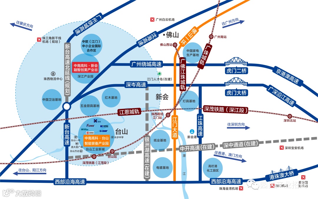 【园区交通】三纵三横三港立体交通网路,有新台高速、沈海高速、西部沿海高速,中开高速(在建)、深中通道、深茂铁路等,1.5小时内畅达大湾区。