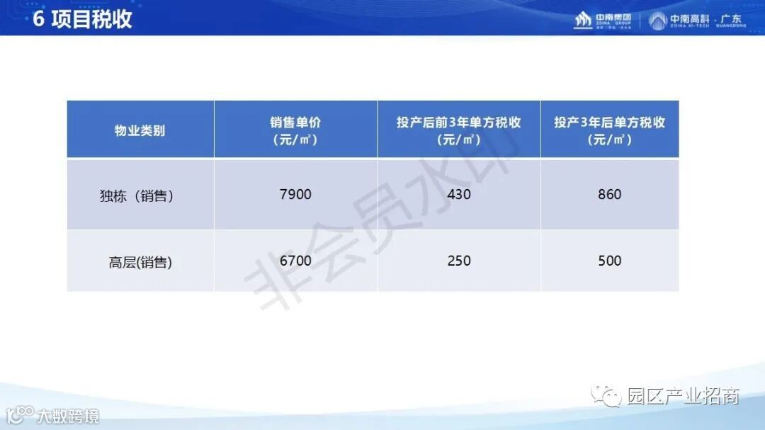 税收要求:投产后前3年税收独栋430元/平,大平层投产后前3年250元/平。