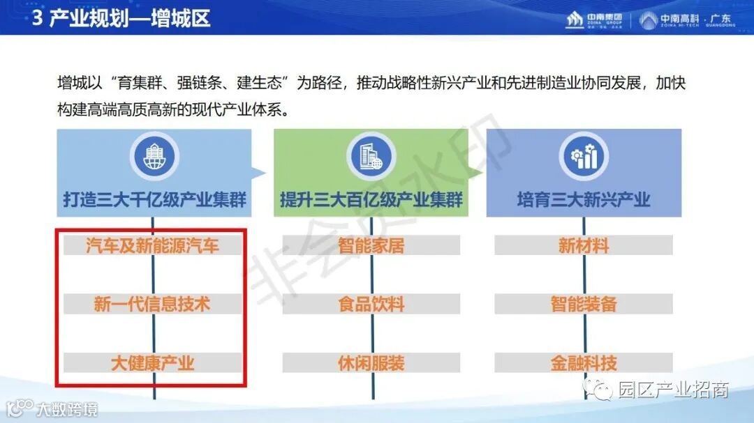 根据广州十四五规划明确指出:构建“广州创新大脑+佛山转化中心”区域创新发展格局,将新一代信息技术、智能与新能源汽车、生物医药与健康产业打造成为新兴支柱产业,增城位于东部产业集聚带,共建多条完备产业链条、辐射带动力强的战略性新兴产业集群