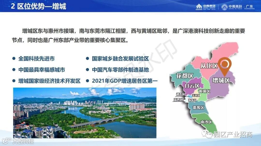 增城区东与惠州市接壤,南与东莞市隔江相望,西与黄埔区毗邻,是广深港澳科技创新走廊的重要节点,同时也是广州东部产业带的重要核心集聚区。