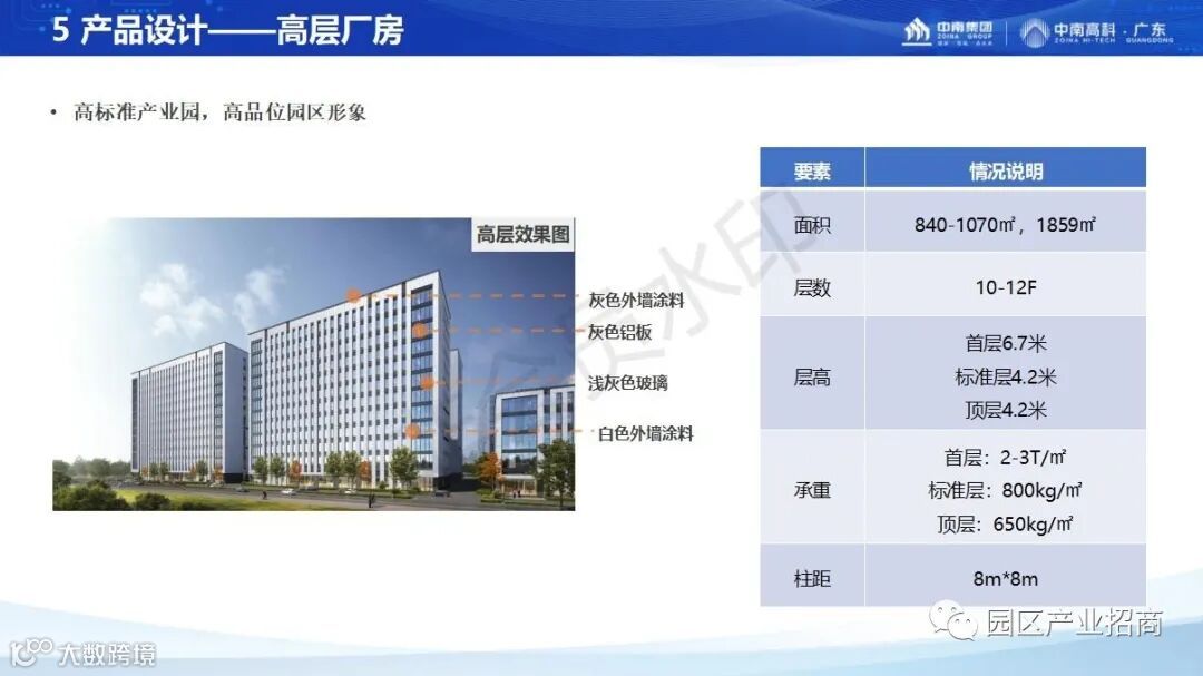 高层大平层厂房:首层6.7米,标准层4.2米,顶层4.2米,承重首层:2-3T/㎡,标准层:800kg/㎡,顶层:650kg/㎡,柱距8m*8m、