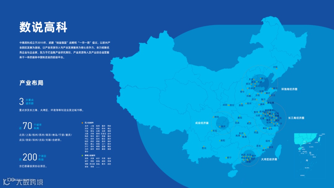 中南高科产业集团成立于2015年,7年时间已经成功进驻全国70城,布局近200个项目(含意向签约项目),短短数年时间,布局全国长三角、珠三角、环渤海和成渝经济圈,依托强大的品牌影响力、资源整合能力和园区运营能力,助力区域产业升级和发展。