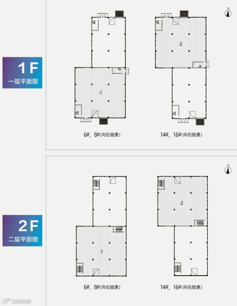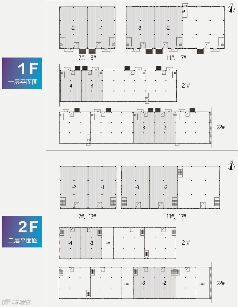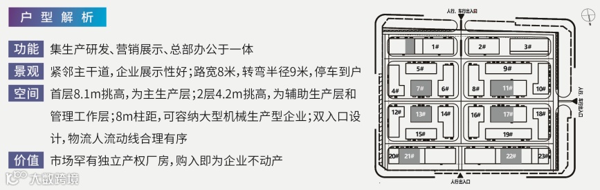在售面积区间为500㎡-3000㎡,主力户型500㎡、 800㎡、1200㎡,除10#/18#/23#号楼为三层外,其余楼栋均为两层。首层层高8.1米,二层层高4.2米, 8米超宽柱距,厂房空间灵动性强,满足企业不同功能需求。