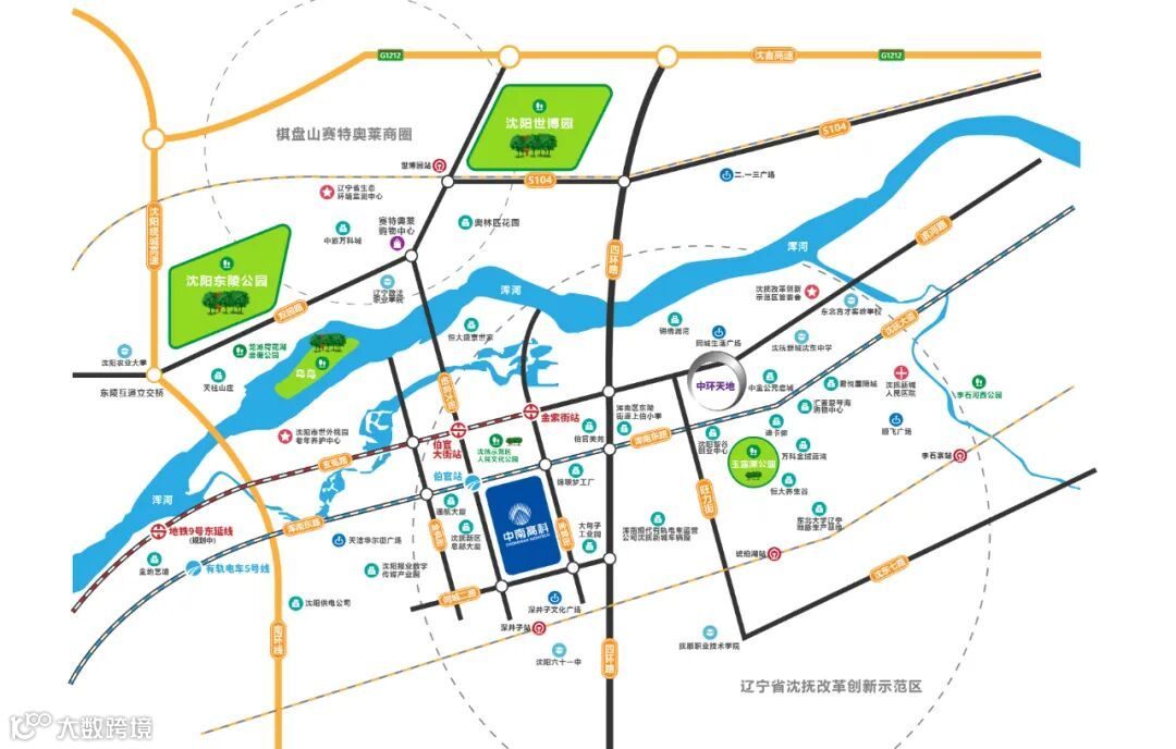▶地铁9号东沿线:该线路串联浑南及抚顺西部区域,距离项目地约1.6公里,步行10分钟(预计23年竣工);