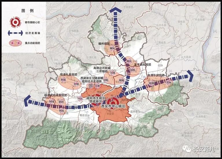 西安都市圈发展空间格局:“一核、两轴、多组团”
