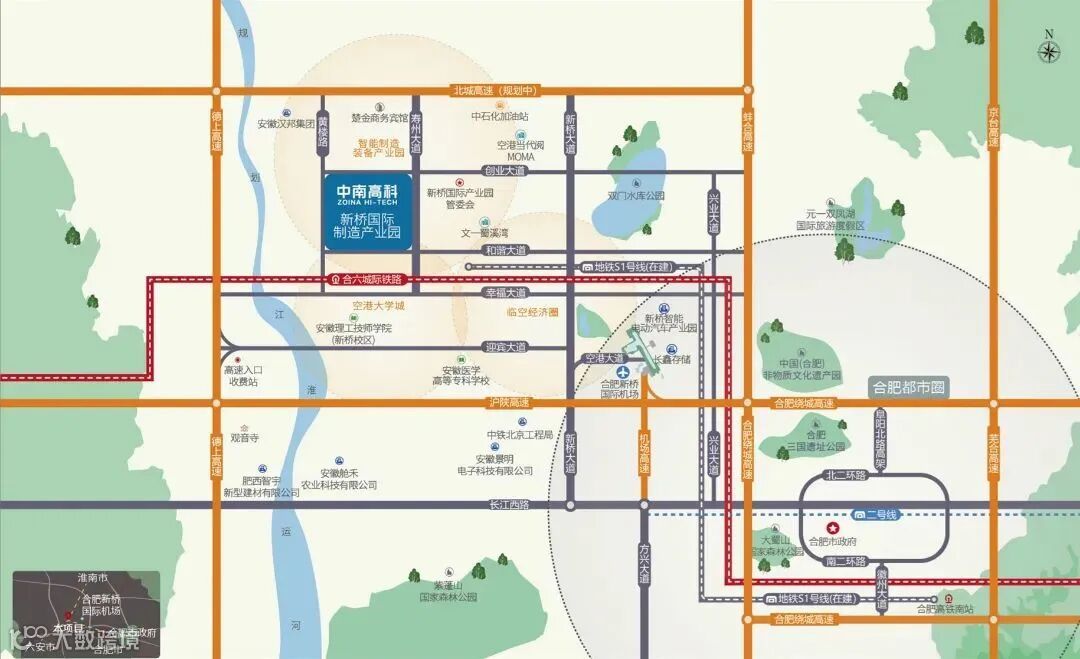 中南高科·新桥智能制造产业园于新桥国际产业园头部示范区,在合肥都市圈辐射影响与空港新城带动下,新桥国际机场以及地铁S1号线、合新六城际铁路等交通优势利好不断,目前以蔚来汽车为首的龙头企业与新桥国际产业园达成合作意向,未来将推动一大批汽车产业装备制造业的发展。