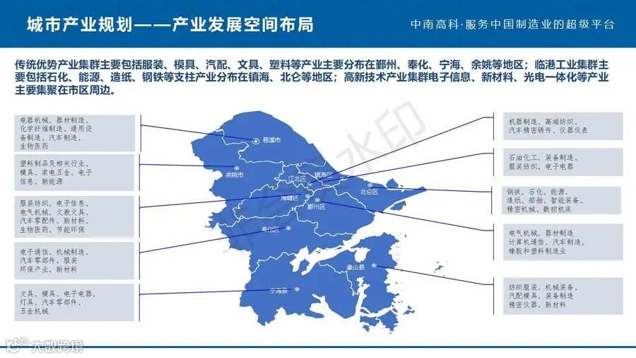 传统优势产业集群主要包括服装、模具、汽配、文具、塑料等产业主要分布在鄞州、奉化、宁海、余姚等地区;临港工业集群主要包括石化、能源、造纸、钢铁等支柱产业分布在镇海、北仑等地区;高新技术产业集群电子信息、新材料、光电一体化等产业主要集聚在市区周边。