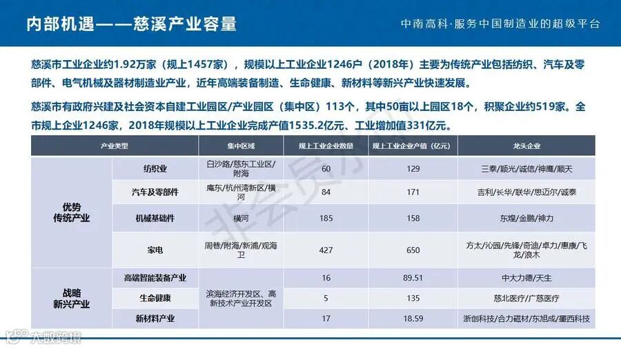 慈溪市工业企业约1.92万家(规上1457家),规模以上工业企业1246户(2018年)主要为传统产业包括纺织、汽车及零 部件、电气机械及器材制造业产业,近年高端装备制造、生命健康、新材料等新兴产业快速发展。