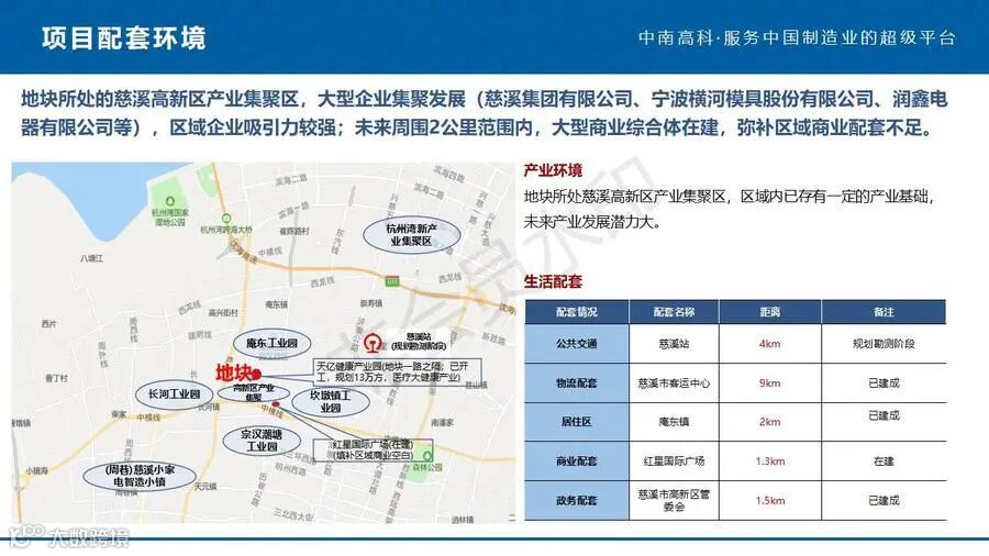 地块所处的慈溪高新区产业集聚区,大型企业集聚发展(慈溪集团有限公司、宁波横河模具股份有限公司、润鑫电器有限公司等),区域企业吸引力较强;未来周围2公里范围内,大型商业综合体在建,弥补区域商业配套不足。