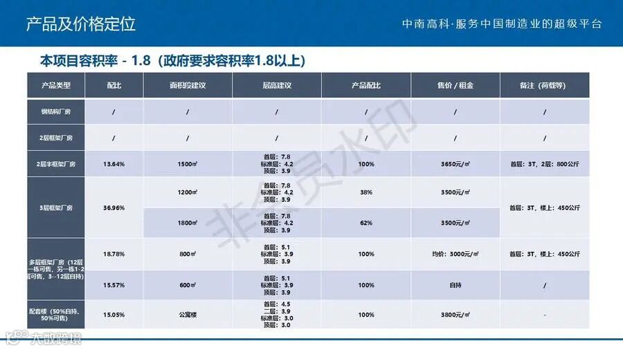 【项目简介】∶项目一期共建设标准厂房12栋共34套,并建设一幢10层综合楼;单体建筑2层半、3层、12层的双拼、三拼类产品;一层层高5.1-7.8米,主力面积范围约1200-6000方,可自由组合;布局方正,高承重,柱网8米,可满足不同类型企业生产、研发、办公等多种需求。