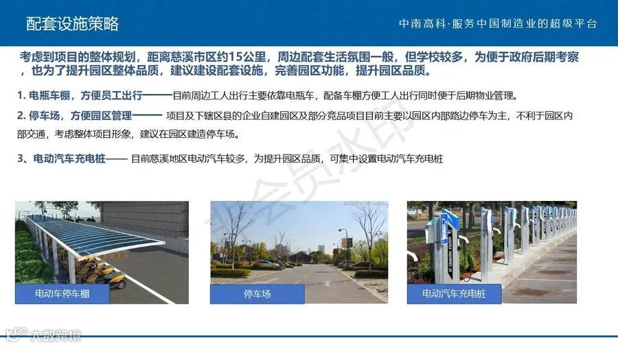 考虑到项目的整体规划,距离慈溪市区约15公里,周边配套生活氛围一般,但学校较多,为便于政府后期考察,也为了提升园区整体品质,建议建设配套设施,完善园区功能,提升园区品质。