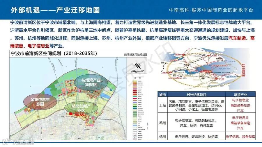 宁波前湾新区位于宁波市域最北端,与上海隔海相望,着力打造世界级先进制造业基地、长三角一体化发展标志性战略大平台、沪浙高水平合作引领区,新区作为沪杭甬三地中间点,随着沪嘉甬铁路、杭甬高速复线等重大交通通道的规划建设,加快与上海、苏州、杭州等地同城化进程,同时承接上海、苏州、杭州产业外溢,根据产业转移指导方向,宁波优先承接发展汽车制造、高端装备、电子信息业等产业。