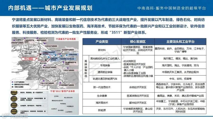 宁波将重点发展以新材料、高端装备和新一代信息技术为代表的三大战略性产业,提升发展以汽车制造、绿色石化、时尚纺织服装等五大优势产业,加快发展以生物医药、海洋高技术、节能环保为代表的一批新兴产业和以工业创新设计、软件信息服务、科技服务、检验检测为代表的一批生产性服务业,形成“3511”新型产业体系。
