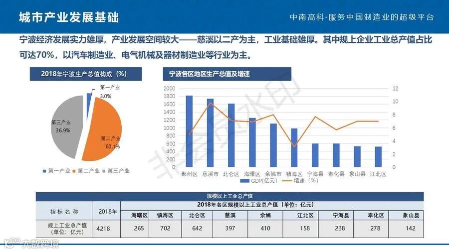 宁波经济发展实力雄厚,产业发展空间较大——慈溪以二产为主,工业基础雄厚。其中规上企业工业总产值占比可达70%,以汽车制造业、电气机械及器材制造业等行业为主。