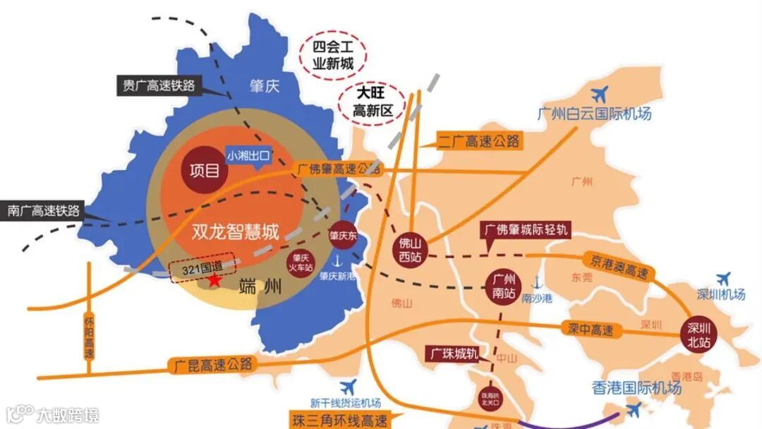 项目位于肇庆端州,地理位置优越,拥有成熟的交通网络。拥有1条城际轻轨,2条铁路,3条高速极速连接广州、佛山核心地区。到达佛山、广州机场不超过90分钟。通过路网的连接,可在短时间内通往深圳、东莞、珠海、中山、澳门等大湾区城市,加强城市间的产业连接,与世界商贸无缝连接。