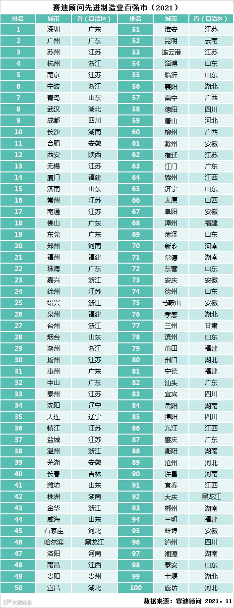 先进制造业是构建现代产业体系、培育发展新动能、助推经济高质量发展的重要手段,是城市能级和核心竞争力的重要体现。赛迪顾问智能装备产业研究中心从创新能力、融合发展、经济带动、品牌质量和绿色集约五个维度27项指标,对全国293个地级市的先进制造业发展情况进行了系统研究和综合评估,发布先进制造业百强市(2021)榜单。