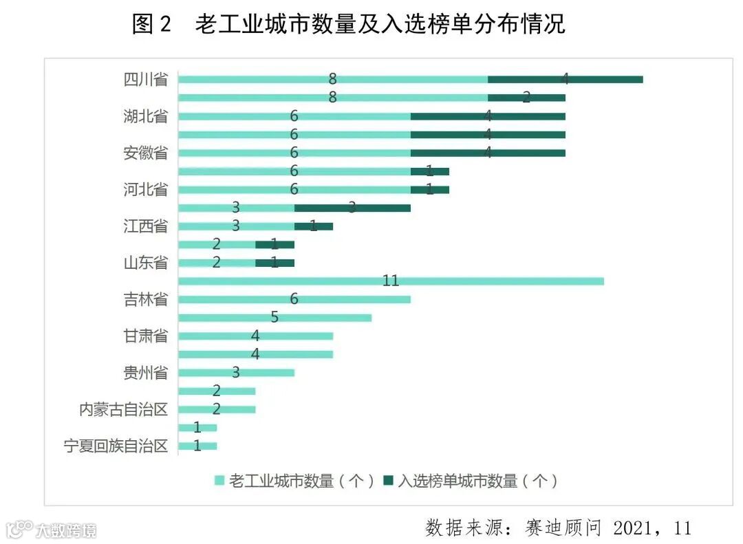东北地区老工业城市振兴步伐落后于中西部地区。全国95个老工业城市中有26个入榜,其中,59个中西部地区老工业城市有20个入围,四川入选城市最多。13个东部地区老工业城市有5个城市入围,其中江苏常州、徐州、镇江3个老工业城市全部入围,并位居榜单老工业城市排名前三甲。东北地区有23个老工业城市,仅有大庆一城入围。