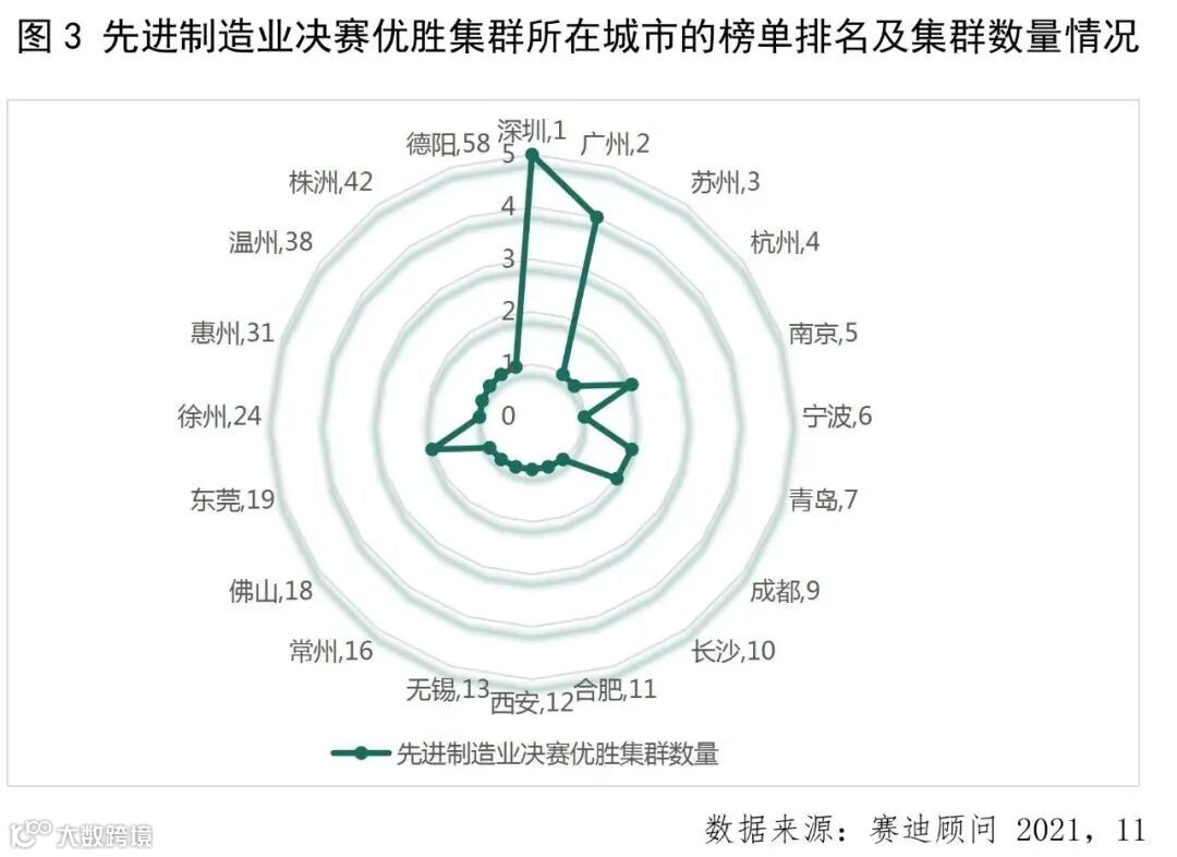 先进制造业决赛优胜集群所在城市优势突出。全国25个先进制造业优胜集群分布在20个城市,其中深圳、广州、南京、青岛、成都各拥有2个及以上决赛优胜集群,这些城市位列榜单前十。合肥、西安、无锡、常州、东莞5个城市位列前二十,徐州、惠州、温州、株洲、德阳5个城市位列前六十。
