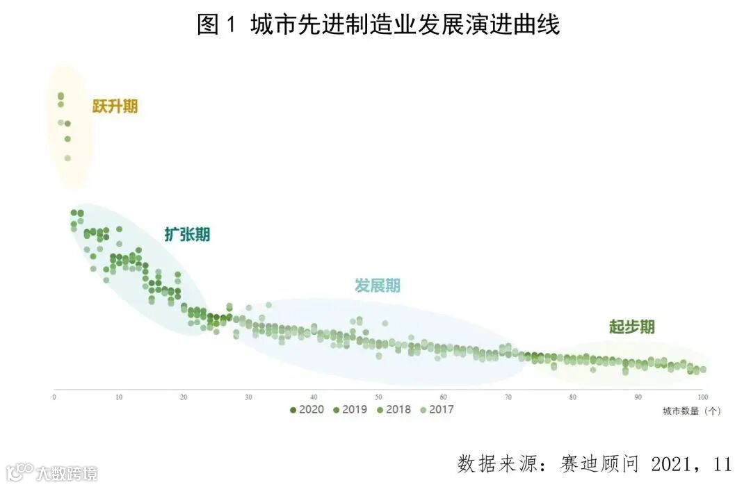 城市是先进制造业发展的重要载体。基于长期对国内城市先进制造业发展的深入观察和系统研究,赛迪顾问智能装备产业研究中心提出了城市先进制造业发展演进曲线。总体看来,我国城市先进制造业发展演变阶段可概括为起步期、发展期、扩张期和跃升期。从起步期迈向发展期的城市应做大产业规模推动先进制造业发展;从发展期迈向扩张期的城市应着力打造先进制造业产业集群,加强企业梯度培育;从扩张期迈向跃升期的城市应以创新为引领,打通制约优质资源要素流动的堵点,推动先进制造业发展的质量跃升。