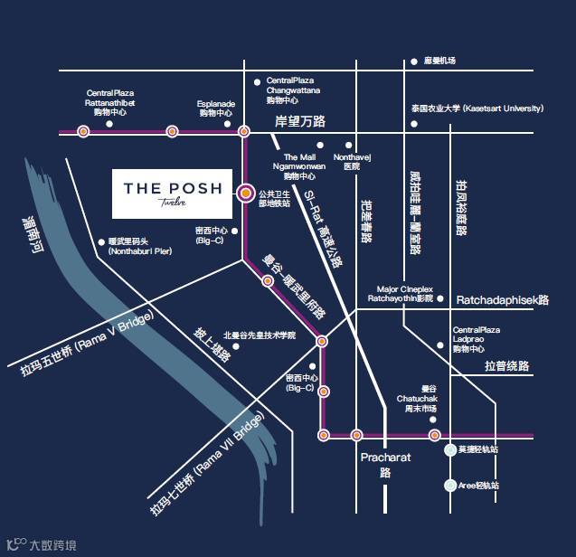 地铁紫色线是隶属于曼谷市快速公共交通运输管理局(MRTA)的快速运输路线。地铁紫色线始发于BangSue,通往曼谷城区,于2016年正式运营 The posh-暹罗华庭的住户可轻松到达400多个公共交通站台(包括到2030年前完工的新站台),步行即可到达机场快线。 项目周边配套设施 交通 公交车站100米 地铁站公共卫生部站120米 廊曼机场——车程20分钟