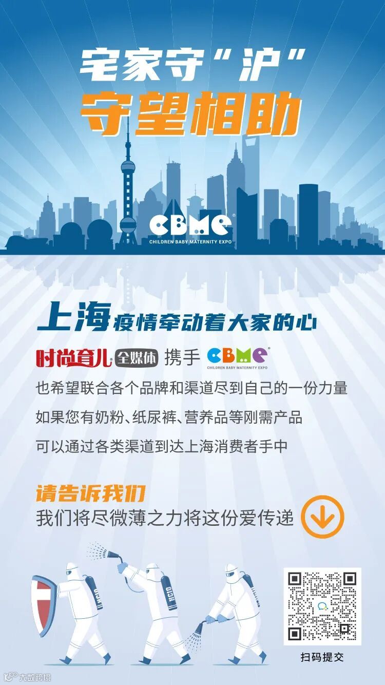 时尚育儿全媒体携手CBME 也希望联合品牌和渠道尽到自己的一份力量。如果您有奶粉,纸尿裤,营养品等刚需产品,可以通过各类渠道到达上海消费者手中,请与我们联系,我们将尽微薄之力将这份爱传递!