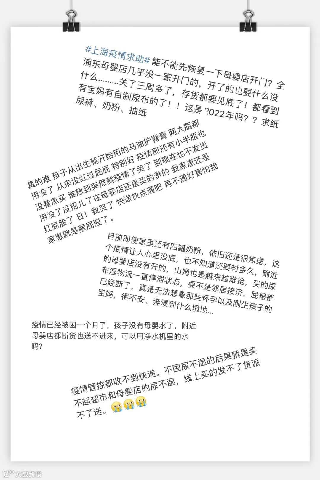 近日,上海疫情牵动着大家的心。紧急封控,宝宝所需物资,如奶粉、纸尿裤、营养品等生活易耗品的采买成了许多宝妈们面临的一大难题。社交平台上也看到了宝妈们在不断发声。